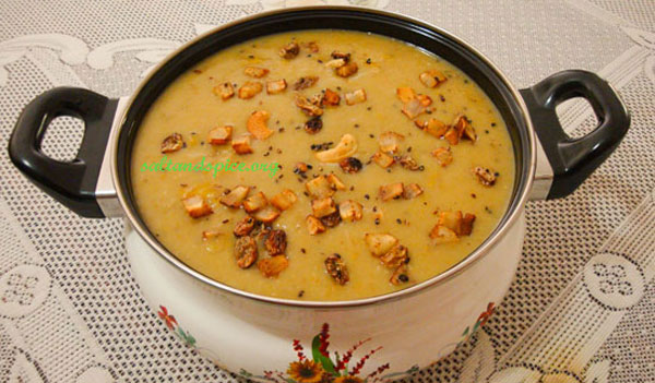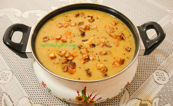 Pressure cook cracked wheat along with 4 cups of water, on a low flame for 7 minutes, after the first whistle. Use a 5 or 8 litre cooker. Melt the jaggery along with 1/2 cup of water. Strain it and keep aside. Heat 1 1/2 tsp of ghee in a non-stick pan and add the banana pieces. Fry it on a medium flame for 5 minutes. By this time it would have become mashed and turned light brown in color. Add the mashed bananas and the melted jaggery to the cooked cracked wheat. Mix well and simmer for 10 minutes. Stir in between. Add 2 cups of thin coconut milk and mix well. Simmer for another 10 minutes more. Add another 2cups of thin coconut milk and simmer for 5 minutes. Add dry ginger powder and cardamom powder. Finally add the thick coconut milk. Switch off the flame before it starts to boil. Heat 2 tsp ghee in a non-stick pan and add the sesame seeds, followed by the coconut pieces. When the coconut pieces are light brown, add the cashew nuts. When they turn light brown, add the golden raisins and switch off the flame. Pour this over the payasam and mix well. Enjoy delicious ‘Godhambu Pazham Pradhaman’ or ‘Cracked Wheat Banana Payasam’ with your loved ones !