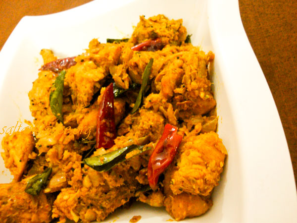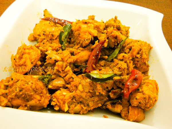 Cook the chicken along with spice powders, salt and water till done. Grind the coconut with green chillies and cumin seeds, to a coarse mixture. Heat oil in a non-stick pan and splutter mustard seeds. Add whole spices, ginger, garlic and dry chillies. Add onions and curry leaves, and fry till the onions turn light brown. Add the crushed coconut mixture and the cooked chicken, along with the left over gravy. Fry till it becomes dry and oil sepatares. Delicious ‘Chicken Thoran / Kozhi Thoran’ is ready. Serve it with rice, chappathi, puttu, appam, idiyappam, dosa or bread. Enjoy!
