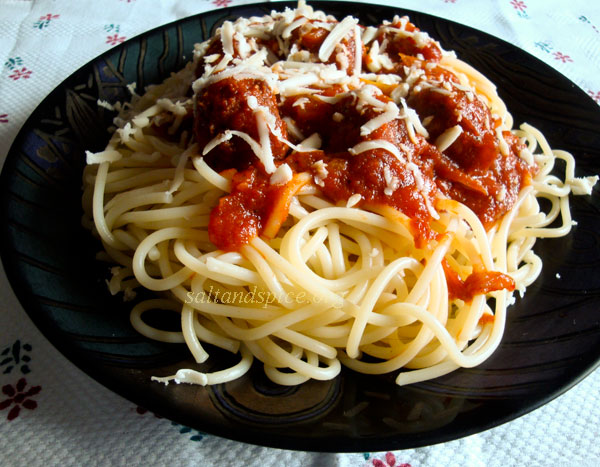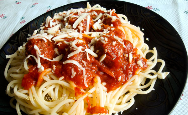 Boil the water and add spaghetti, salt and 1 tsp of oil. Cook for 14 minutes or till done. Drain and wash the spaghetti over cold running water. Deep fry the meat balls and keep aside. Heat oil in a non-stick pan and add garlic and onions. When the onions turn light brown, add the chilly flakes, pepper, pasta sauce, seasoning, sugar and salt. When it boils, add the meat balls and simmer for 2 minutes. Place the spaghetti in serving plates and spread the meat balls with sauce over it. Serve delicious ‘Spaghetti With Meat Balls’ garnished with grated parmesan cheese. Enjoy with your kids!