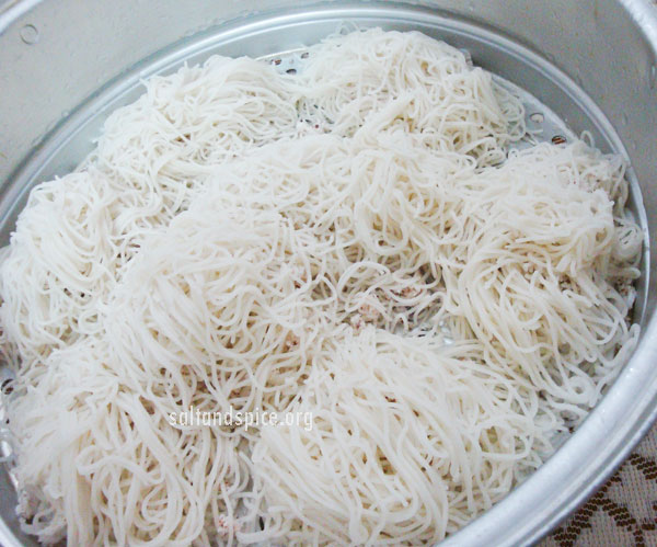 Mix rice flour with the salt. Boil water and add it part by part to the flour and mix with a spoon, till you get a soft dough. Grease the idiyappam mould and the steaming pan with some oil. Take a portion of the dough and fill the mould. Squeeze it onto the pan in circular motion. Place some grated coconut on top and again squeeze the dough on top of it. Repeat the process to make idiyappams. Steam cook for 15 minutes. Serve delicious ‘Idiyappam / String Hoppers’ with kadala curry, green peas curry, stew, egg masala, chicken curry or simply serve it with coconut milk and sugar. Enjoy!