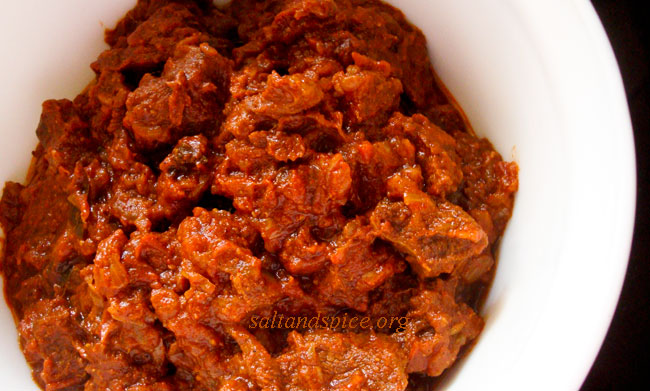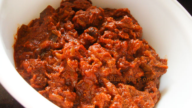 Grind the above mentioned ingredients to a fine paste. Marinate the beef cubes with this paste and salt, for 2 hrs. Heat oil in a pressure cooker and add the onions and curry leaves. Fry till the onions turn light brown. Add the tomatoes and fry till they are soft. Add the marinated beef and fry for 5 minutes. Add 1/2 cup of water to the left over masala and pour over the beef mixture. Pressure cook till the beef is done. Delicious ‘Beef Vindaloo’ is ready to be served. It goes well with rice, sannas, appam, chappathi and bread. Enjoy!