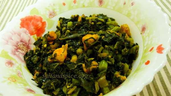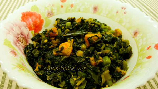 Cook 500 gm prawns with 1 tsp turmeric powder, 1/4 cup of water and salt. Store it in the fridge and use it as required. Heat oil in a non-stick pan and add garlic followed by onions, green chillies and curry leaves. Fry till the onions turn light brown. Add the spice powders and stir. Add spinach, 100 gm cooked prawns, 2 tbsp of water in which the prawns were cooked and salt. Cook covered till done. Stir fry till the spinach is almost dry. Yummy ‘Spinach and Prawns Stir Fry’ is now ready. Serve it with steamed rice. Cheers!