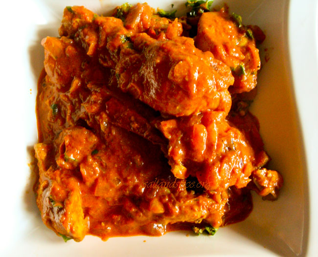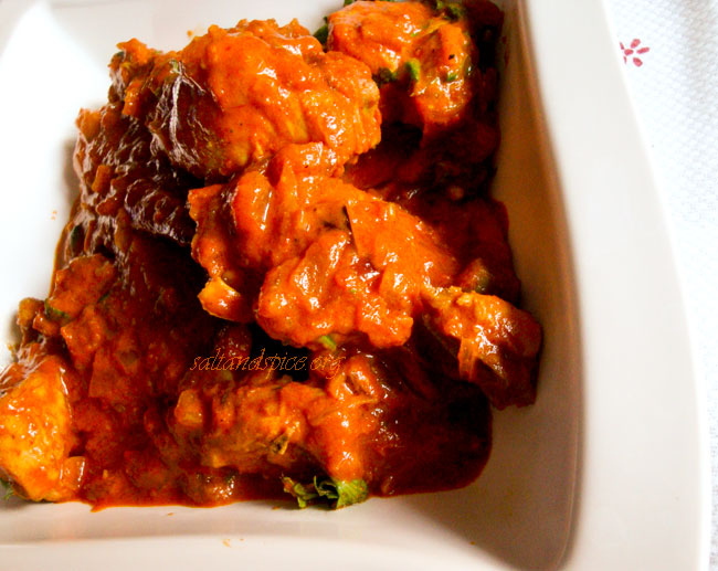 Heat 1 tsp of ghee in a non-stick pan and fry the chicken pieces till they turn light brown in color. Keep them aside. Add oil to the same pan and add the whole spices and onions. Fry well and add ginger-garlic paste and dry chillies. Add the tomato puree and spice powders. Fry till the aroma comes out. Add the fried chicken pieces along with the leftover juices, water and salt. Cook covered till done. Add the thick coconut milk and switch off the flame. Garnish with coriander leaves. Yummy ‘Chicke Madras’ goes well with rice, rotis, porotta, dosa, idli, idiyappam and pulao. Enjoy!