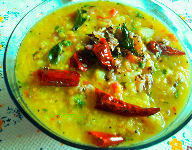 Pressure cook the bottle gourd along with water for 3 minutes on a low flame, after the first whistle. Allow it to cool. Add the rest of the ingredients and pressure cook for another 4 minutes. Allow it to cool. Add the coriander leaves to the curry and mix well. Add more water if it is too thick. Simmer for a minute and switch off the flame. Heat oil in a small non-stick pan and do the tempering. Pour it over the lauki dal curry and mix well. Serve delicious ‘Bottle Gourd and Moong Dal Curry’ with rice, chappathi, puri or idli. Enjoy!