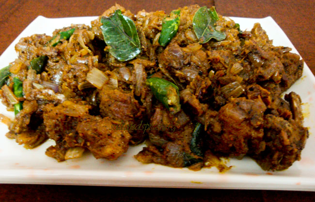 Pressure cook mutton along with the above mentioned ingredients, for 20 minutes or till done. Heat oil in a non-stick pan and splutter aniseeds. Add onions, green chillies and curry leaves. Fry till the onions turn light brown. Add the spice powders and sprinkle some water. Fry till the aroma comes out. Add the cooked mutton along with left over gravy. Adjust the salt and fry till oil separates. Lip-smacking ‘Mutton Pepper Fry’ is ready. Serve it as a side dish with rice, pulao, rotis, appam, puttu, idiyappam, dosa or bread. Enjoy!
