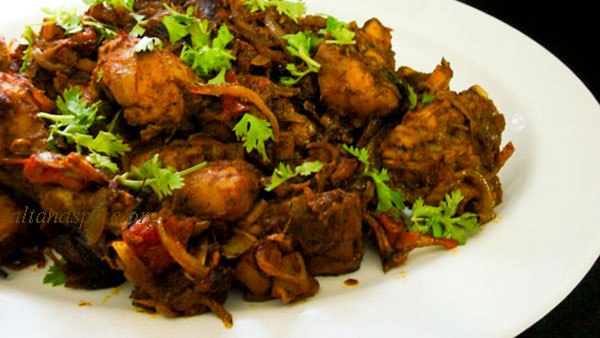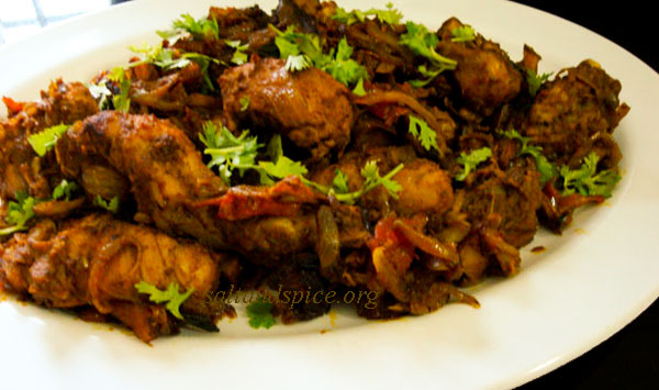 Cook the chicken pieces along with the spice powders, water and salt. Heat oil in a non-stick pan and add garlic and ginger followed by onions, green chillies, curry leaves and coconut pieces. Fry till the onions turn golden brown. Add the spice powders and spinkle some water. Fry till the aroma comes out. Add the tomatoes and fry well. Now add the cooked chicken and stir-fry till the chicken turns dark brown in color. Garnish with coriander leaves. Lip-smacking ‘Chicken Stir Fry / Kozhi Ularthiyathu’ is now ready! It is a good side dish for rice, pulao, appam, idiyappam, chapathi, porotta and bread. Enjoy with your loved ones!