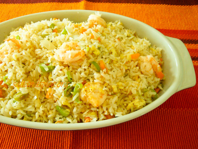 Cook the rice along with water in a rice cooker. Allow it to cool. Heat oil in a non-stick wok and add garlic followed by onions, beans and carrots. Stir-fry for 2 minutes and then add the cabbage and prawns. Cook for another 2 minutes more. Keep the veggies and prawns to a side and add the eggs. Stir-fry the eggs and mix all together. Now add the cooked rice, soy sauce, pepper powder, salt, sugar and aginomotto. Stir-fry on a high heat for 2 minutes. Serve yummy ‘Prawn Fried Rice’ with Thai sweet chilli sauce or any side dish of your choice. Enjoy with your kids!
