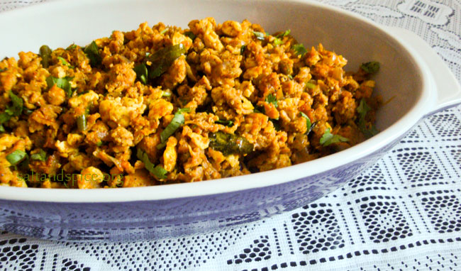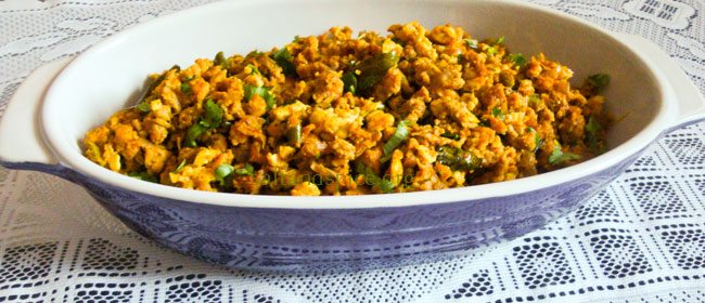 Pressure cook the minced meat along with ginger-garlic paste, spice powders, salt and water for 5 minutes on a low flame, after the first whistle. Heat oil in a non-stick pan and saute’ onions, green chillies and curry leaves. Beat the eggs with a pinch of salt and stir fry. Add the cooked minced meat, pepper powder, garam masala and maggi cube. Stir fry till it is dry. Garnish with coriander leaves. Yummy ‘Minced Meat and Egg Scramble’ can be served with rice, rotis, bread, appam and dosa. Enjoy with your kids!