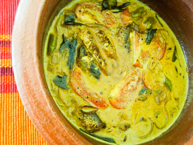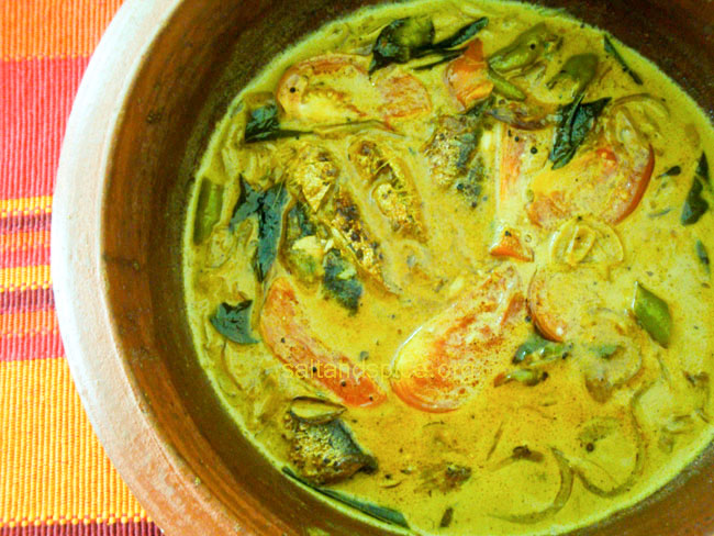 Clean the sardines and make slits on them. Make a paste of all the spice powders, vinegar and salt using some water. Marinate the sardines with the paste for an hour and fry them in oil. Heat oil in a clay pot or a pan and splutter mustard seeds. Add onions, ginger, garlic, green chillies and curry leaves. Fry till the onions turn pink in color. Add the spice powders and sprinkle some water. Fry till the aroma comes out. Add the thin coconut milk, vinegar and salt. When it boils, add the tomatoes and simmer for 2 minutes. Then add the fried sardines and the thick coconut milk. Switch off the flame before it starts to boil. Delicious ‘Mathi Mappas / Fried Sardines Curry with Coconut Milk’ goes well with rice, appam, idiyappam, puttu, dosa, idli, chapathi, porotta, pulao and bread. Enjoy with your loved ones!