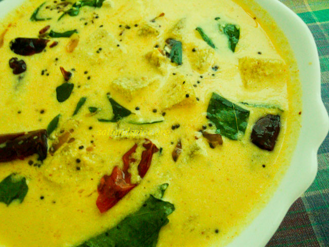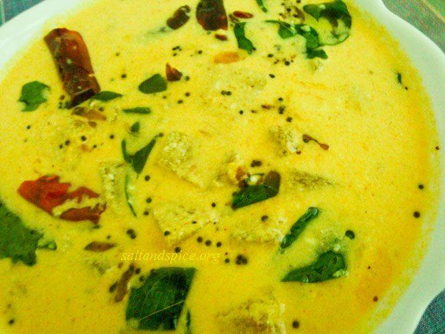 Pressure cook the ash gourd along with turmeric powder, chilly powder, water and salt for 2 minutes on a low flame, after the first whistle. Grind the mentioned ingredients to a fine paste and add to the cooked ash gourd. Pour the curd into the curry and stir continuously. When it starts to boil, switch off the flame. Fry the mentioned ingredients in oil and pour over the curry. Serve tasty ‘ Kumbalanga Moru Curry / Ash Gourd Moru Curry’ with steamed rice, pickle and pappad. Cheers!